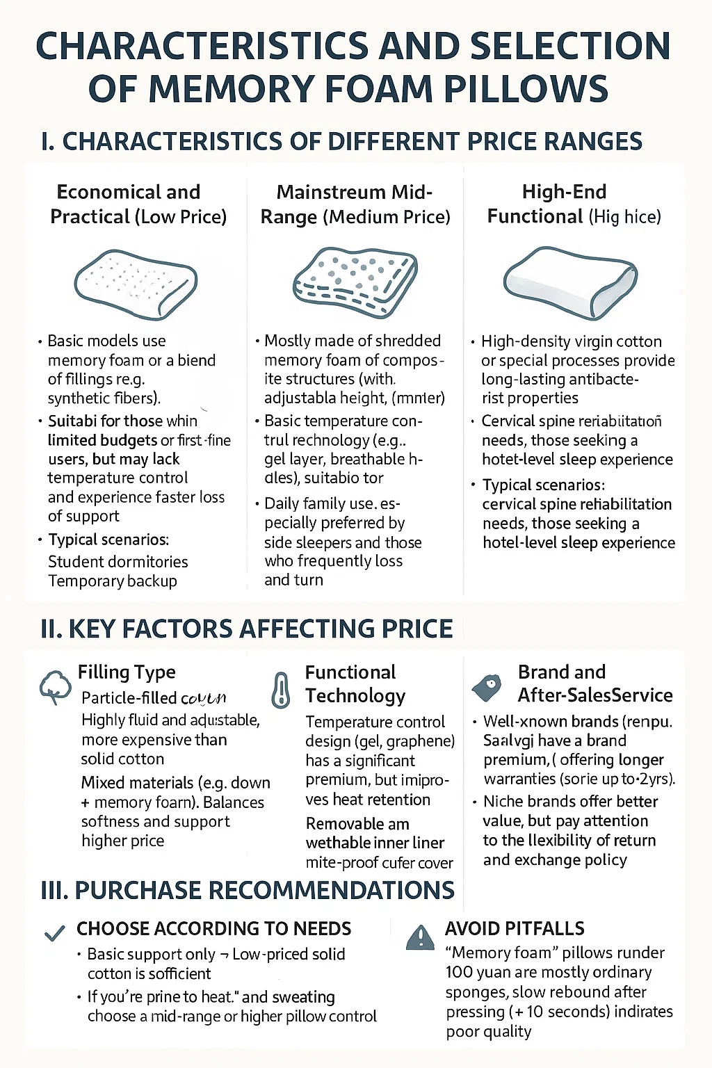 • Model dasar menggunakan busa memori atau campuran bahan pengisi (misalnya serat sintetik yang diparut kapas), dengan harga terjangkau.