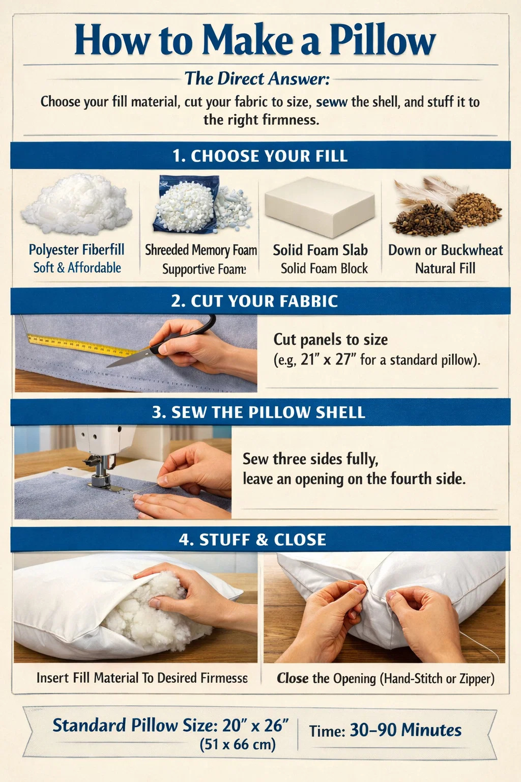 Membuat bantal terdiri dari empat hal mendasar: memilih bahan pengisi, memotong kain sesuai ukuran, menjahit cangkangnya, dan mengisinya dengan kekencangan yang tepat. Bagi kebanyakan orang, bantal tempat tidur standar berukuran 20 × 26 incici (51 × 66 cm) , dan seluruh proses—mulai dari memotong kain hingga menutup jahitan akhir—membutuhkan waktu antara 30 dan 90 menit tergantung pada jenis isian Anda. Jika Anda menggunakan bantal busa memori, prosesnya sedikit berbeda karena Anda memotong atau merobek busa daripada mengisi dengan serat lepas, namun pendekatan strukturalnya tetap sama.